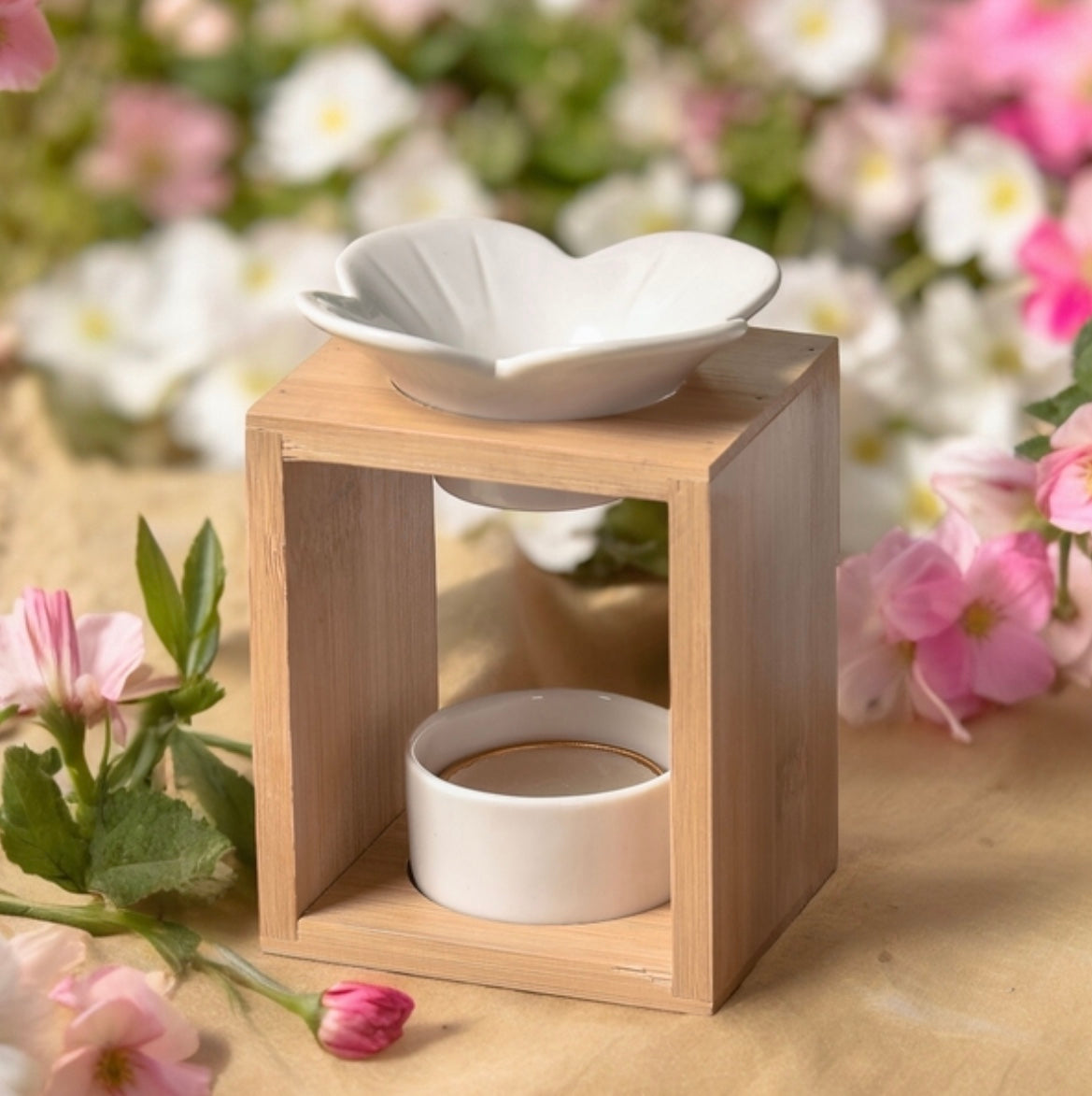 Brûleur plumeria avec coupelle en céramique. La base est en bambou