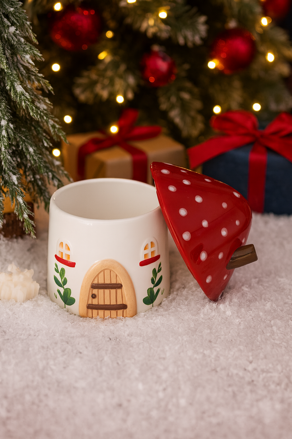 Maison champignon sur le thème de Noël.