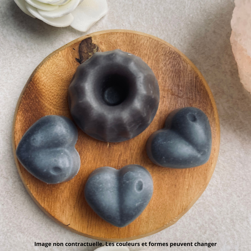 Composition: 89 % de cire de soja,10 % de fragrance de Grasse,1% de colorant naturel (poudre de mica ou pastel de cire ou mix des 2).
