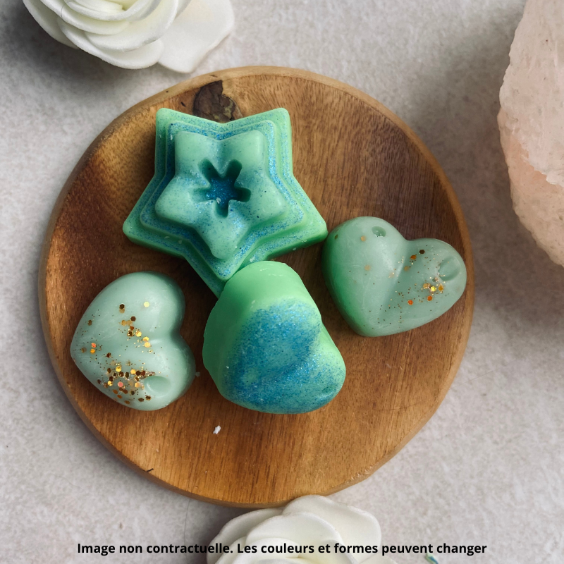 Poids: 10 grammes Diffusion de nos fondants parfumés entre 5 et 8 h dépendant du parfum. Nos fondants parfumés sont réalisés à base de cire de soja 100 % naturelle provenant de Belgique. La composition est de 89% de cire de Soja (mix) ,de 10 % de parfum de Grasse et de 1% de colorants naturels sous forme de poudre de Mica, liquide ou de pastilles de cires. Tous nos fondants sont garantis sans phthalate, sans pesticide. Ils répondent aux normes européennes IFRA50, CLP CE N°1272/2008, REACH 2020/878, non testé sur les animaux.La cire de soja est 100% végétale et vegan. Garantie sans substances CMR (Substances Cancérigènes, Mutagènes et Reprotoxiques).